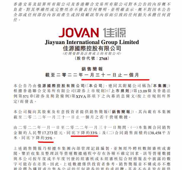 2月14日訊:近日,佳源國際控股有限公司(簡稱:佳源國際控股,2768.HK)發(fā)布公告稱,2022年1月合同銷售金額約人民幣17.27億元,同比下降約33%;及合同銷售面積約13.85萬平方米,同比下降約35%。
