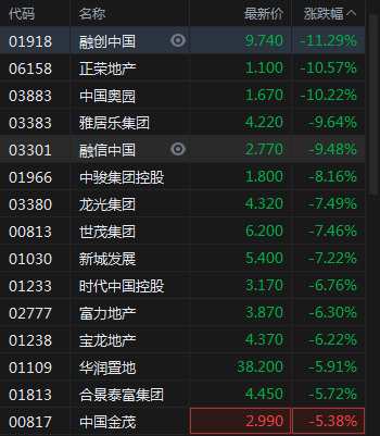 內(nèi)房股午后跌幅擴(kuò)大 融創(chuàng)中國跌超11%中國奧園跌超10%
