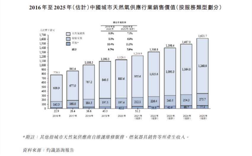 預(yù)計(jì)2025年中國城市天然氣供應(yīng)行業(yè)的銷售價值將達(dá)人民幣16,217億元,2020年至2025年的復(fù)合年增長率為7.5%。受管道天然氣消耗量增加及管網(wǎng)擴(kuò)張帶動,中國按銷售價值計(jì)算的接駁安裝服務(wù)市場規(guī)模由2016年的人民幣1,453億元增至2020年的人民幣1,974億元,期間復(fù)合年增長率約為8.0%。預(yù)期市場規(guī)模將繼續(xù)增長,至2025年達(dá)到人民幣2,757億元,2020年至2025年的復(fù)合年增長率約為6.9%。