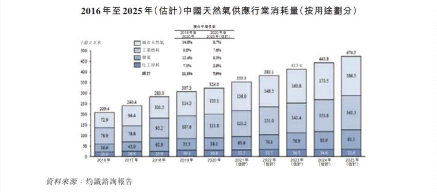 從行業(yè)發(fā)展來看,中國城市天然氣供應(yīng)行業(yè)的消耗量可分為四個板塊:城市天然氣、工業(yè)燃料、發(fā)電和化工材料。中國城市天然氣供應(yīng)行業(yè)的消耗量由2016年的2,094億立方米急速增加至2020年的3,240億立方米,復(fù)合年增長率為11.5%。