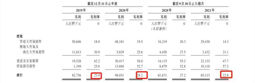 而截至2019年及2020年12月31日止年度以及截至2021年9月30日止九個月,交運(yùn)燃?xì)饷史謩e約為23.4%、28.2%及22.8%,值得注意的是,交運(yùn)燃?xì)饨刂?021年9月30日止九個月毛利率顯著下滑,公司解釋為主要由于隨著2019冠狀病毒病爆發(fā)對高密市工業(yè)營運(yùn)的不利影響逐漸消退,管道天然氣終端用戶售價恢復(fù)得較慢,而管道天然氣采購價恢復(fù)得較快。