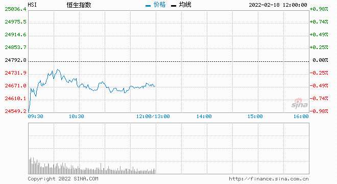 摘要: 2月18日消息,美股周四大幅收跌,道指錄得今年迄今的最大單日跌幅。今日開盤,恒生指數(shù)低開0.64%,隨后跌幅收窄。截至午間收盤,恒生指數(shù)跌0.48%,報(bào)24674.91點(diǎn);國(guó)企指數(shù)跌0.39%,