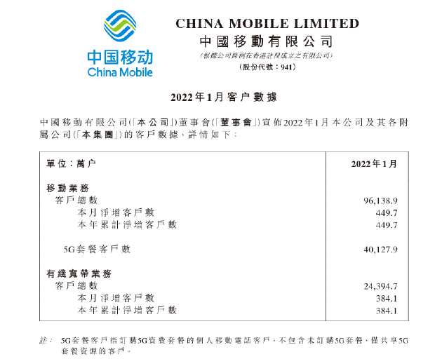 中國移動港股公告:1月新增449.7萬戶用戶5G用戶數(shù)超4億