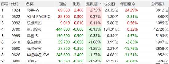 恒生科技指數(shù)一度重挫3%,收跌1.89%,快手漲2.75%,聯(lián)想集團(tuán)翻紅,騰訊跌0.13%,嗶哩嗶哩、網(wǎng)易、美團(tuán)等跌幅收窄。