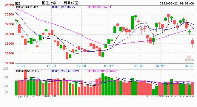 俄烏局勢(shì)升級(jí),當(dāng)?shù)貢r(shí)間2月21日,俄羅斯股市大幅下挫。俄羅斯MOEX指數(shù)一度跌超15%,俄羅斯交易系統(tǒng)指數(shù)(RTS)一度跌超17%。今日早盤,港股重挫3%,午后恒指窄幅震蕩,截至收盤,恒指跌2.69%,報(bào)23520點(diǎn),國(guó)企指數(shù)跌2.19%,紅籌指數(shù)跌0.97%。
