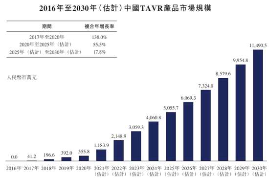 從市場規(guī)模來看,中國TAVR市場于2020年達到人民幣5.56億元,2017年至2020年的復(fù)合年增長率為138.0%,TAVR市場預(yù)計將于2025年增加至人民幣50.56億元,于2030年增加至人民幣114.91億元,2020年至2025年的復(fù)合年增長率為55.5%,而2025年至2030年的復(fù)合年增長率為17.8%。