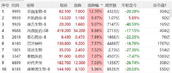 醫(yī)藥股走高,榮昌生物漲近13%,開拓藥業(yè)漲10%,康方生物漲超9%,再鼎醫(yī)藥漲8.88%,百濟(jì)神州、信達(dá)生物、泰格醫(yī)藥(300347)等漲超7%。