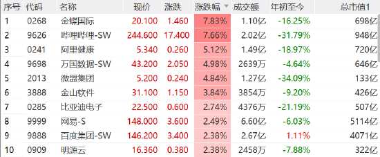 恒生科技指數(shù)大漲1.43%,一度漲超2.5%,金蝶國際漲近8%,嗶哩嗶哩漲7.66%,阿里健康漲超5%,網(wǎng)易、百度、美團(tuán)、京東漲超2%。