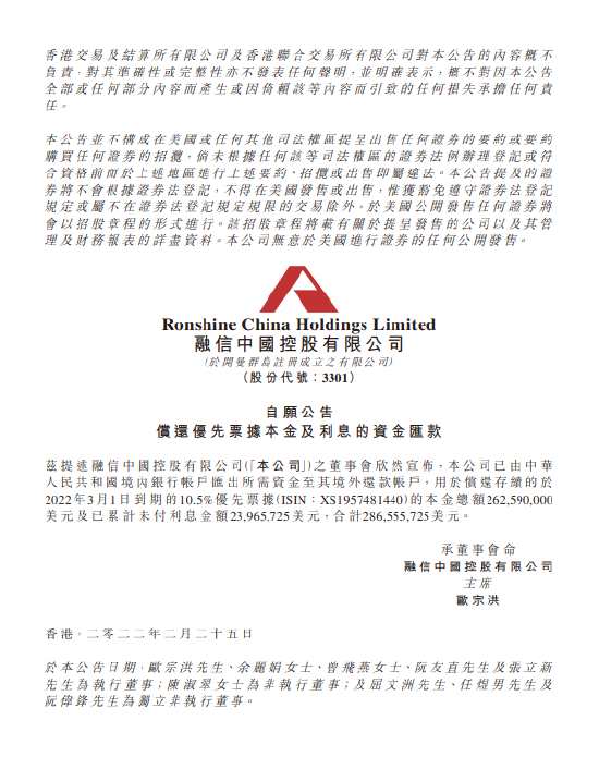 摘要: 2月25日消息,融信中國發(fā)布公告,公司已由境內(nèi)銀行帳戶匯出所需資金至其境外還款帳戶,用于償還存續(xù)的于2022年3月1日到期的10.5%優(yōu)先票據(jù)的本金總額2.63億美元及已累計未付利息金額2396.57