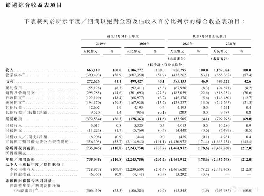 財報顯示,于2019年、2020年及2021年前9個月,公司總收入分別為人民幣6.63億元、11.07億元及11.59億元;同期錄得毛利分別為人民幣2.73億元、4.99億元及4.94億元。