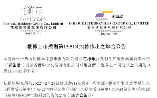 3月1日,花樣年與彩生活發(fā)布聯(lián)合公告,花樣年及彩生活違反于2014年為確保清晰劃分各自業(yè)務(wù)而分拆彩生活時(shí)訂立的契據(jù)及計(jì)劃。