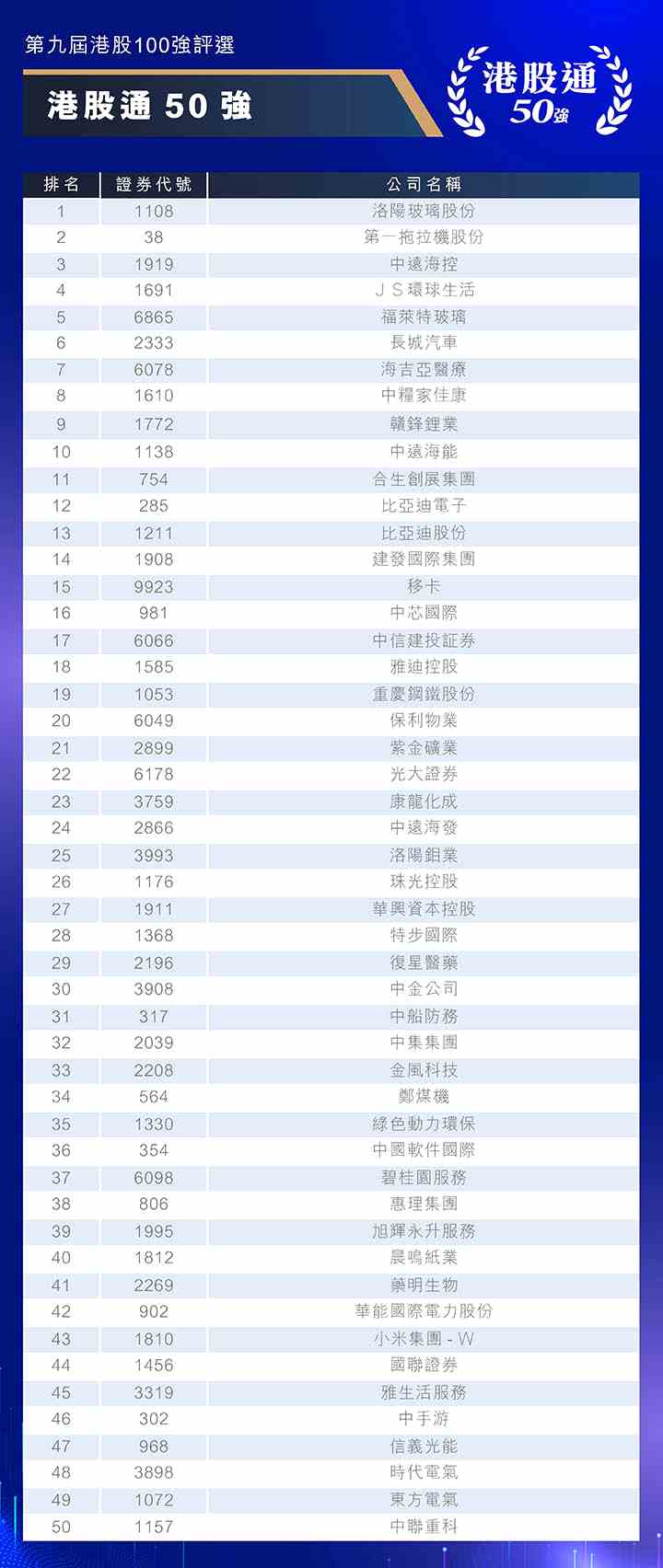 以下為榮獲本屆“港股通50強”的企業(yè)名單: