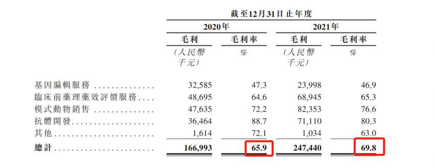 招股書(shū)顯示,2020年與2021年,百奧賽圖毛利率分別為65.9%及69.8%,持續(xù)穩(wěn)定增加,尤其是2021年毛利率接近70%。