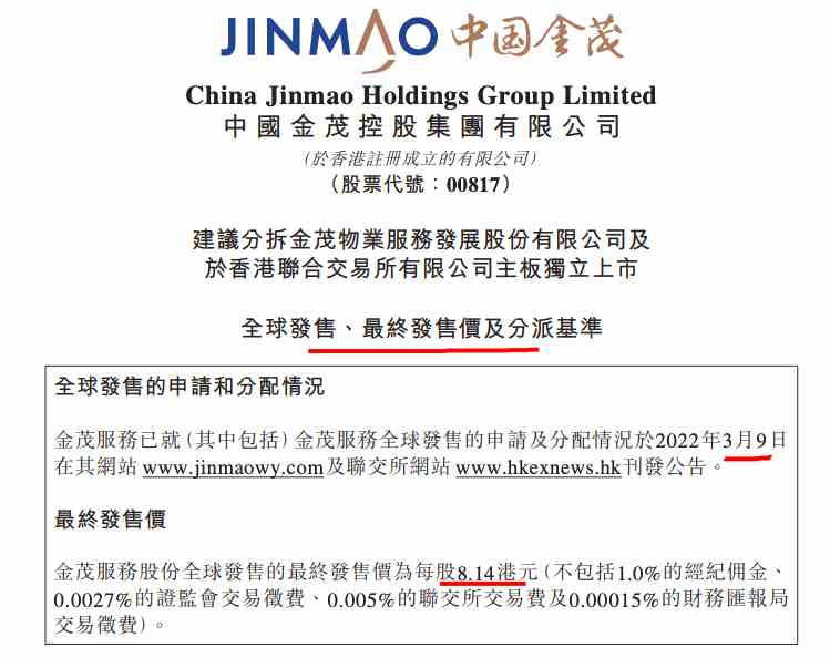 3月9日訊:中國金茂控股集團有限公司(簡稱:中國金茂,0817.HK)發(fā)布公告稱,金茂服務已就(其中包括)金茂服務全球發(fā)售的申請及分配情況于2022年3月9日在其網(wǎng)站及聯(lián)交所網(wǎng)站刊發(fā)公告。據(jù)悉,金茂服務股份全球發(fā)售的最終發(fā)售價為每股8.14港元,每手500股,每手門檻為4070港元。