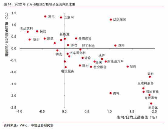中信證券發(fā)研報指,地緣沖突和美聯(lián)儲緊縮預(yù)期放大了投資者對流動性、互聯(lián)網(wǎng)監(jiān)管以及地產(chǎn)風(fēng)險傳導(dǎo)的擔(dān)憂。2月,恒生指數(shù)、國企指數(shù)、恒生科技指數(shù)分別下跌 4.6%/3.9%/5.5%。托管口徑測算,雖然 2 月南向資金流入港股市場趨緩(45.9 億港元),但最后一周南向整體呈現(xiàn)“越跌越買”的趨勢。