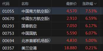 3月10日消息,航空股集體上漲,中國南方航空漲7.53%,中國東方航空漲6.59%,國泰航空漲6.17%,中國國航漲6.07%。