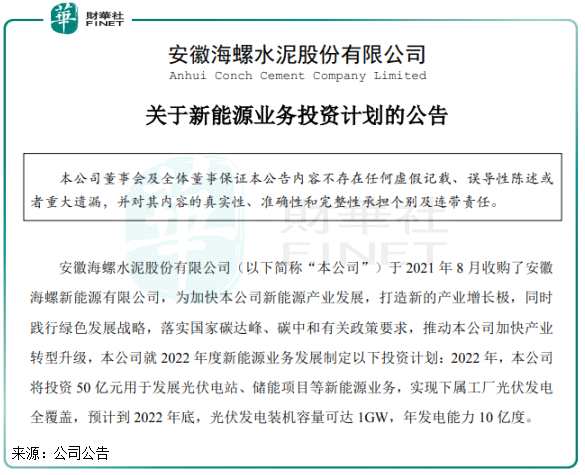 由大幅增加海螺新能源注冊資本,再到豪擲50億布局新能源,海螺水泥自去年以來在新能源領(lǐng)域就投入了至少近百億元。