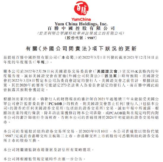 摘要: 百勝中國發(fā)布公告,繼本公司于2022年2月28日向美國證券交易委員會(huì)(‘美國證交會(huì)’)呈交10-K表格內(nèi)的年度報(bào)告后,誠如美國證交會(huì)在實(shí)施《外國公司問責(zé)法》(‘該法案’)時(shí)所預(yù)期,