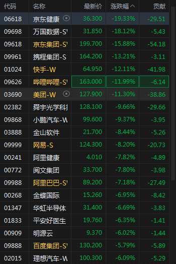 摘要: 3月11日消息,恒生科技指數(shù)跌幅擴(kuò)大至8%,較去年高點(diǎn)跌超60%,成分股全線下跌。京東健康跌超19%,萬國數(shù)據(jù)跌超18%,京東跌近16%,快手跌超12%,嗶哩嗶哩跌11.99%,美團(tuán)跌11.3%,