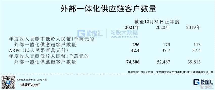 據(jù)財(cái)報(bào)數(shù)據(jù)顯示,得益于持續(xù)拓展和現(xiàn)有客戶的合作范圍、提高服務(wù)深度,助力客戶實(shí)現(xiàn)供應(yīng)鏈數(shù)智化轉(zhuǎn)型,2021年,京東物流外部一體化供應(yīng)鏈的客戶數(shù)量增長(zhǎng)41.7%達(dá)74602家,且?guī)缀醵际秦暙I(xiàn)千萬(wàn)級(jí)以上的“大戶”,同期的單客戶平均收入(ARPC)增長(zhǎng)37.4%,超過(guò)34萬(wàn)元。
