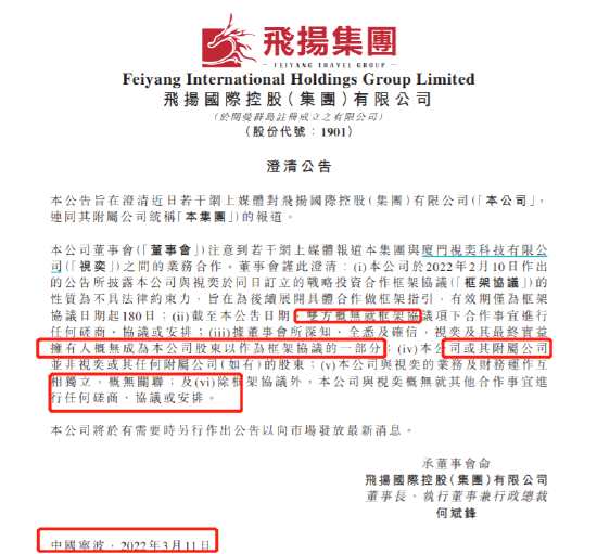 飛揚(yáng)集團(tuán)3月11日晚間火速澄清,“沒有半點(diǎn)關(guān)系”,框架協(xié)議只是合作指引,沒有任何磋商,沒任何商務(wù)關(guān)系,不持有公司股份,沒任何股權(quán)關(guān)系,財(cái)務(wù)獨(dú)立。