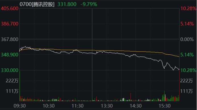 騰訊控股午后閃崩,跌幅一度擴大至超10%,截至收盤跌9.97%,報331.8港元/股,今年以來累計跌幅超25%。
