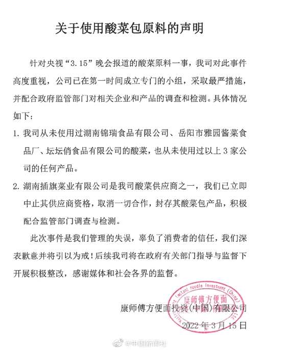 針對(duì)“3·15”晚會(huì)曝光的湖南插旗菜業(yè)“土坑酸菜”食品安全問題,3月16日凌晨,康師傅方便面投資(中國(guó))有限公司發(fā)布聲明稱:湖南插旗菜業(yè)有限公司是我司酸菜供應(yīng)商之一,已立即中止其供應(yīng)商資格,取消一切合作,封存其酸菜包產(chǎn)品,積極配合監(jiān)管部門調(diào)查和檢測(cè)。