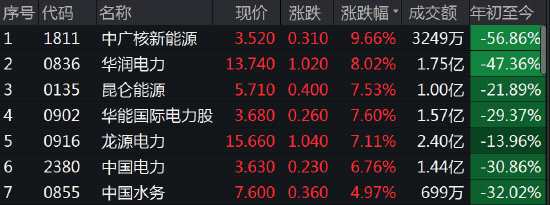 電力股反彈,中廣核新能源漲近10%,華潤電力漲超8%