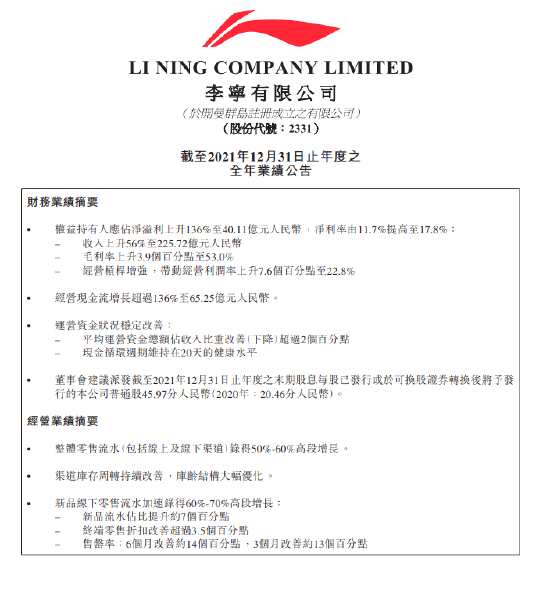 摘要: 3月18日消息,李寧在港交所披露其截至2021年12月31日止全年業(yè)績(jī),2021年?duì)I收達(dá)225.72億元,同比增長(zhǎng)56%;凈利潤(rùn)達(dá)40.11億元,同比增長(zhǎng)136%。