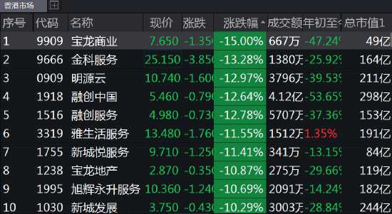 內(nèi)房股和物管股跌幅擴(kuò)大,寶龍商業(yè)跌超15%,金科服務(wù)跌13%,融創(chuàng)中國(guó)、融創(chuàng)服務(wù)跌超12%,雅生活服務(wù)、新城悅服務(wù)跌超11%,寶龍地產(chǎn)、新城發(fā)展跌超10%,龍光集團(tuán)、禹洲集團(tuán)、中國(guó)奧園等紛紛跌超8%。