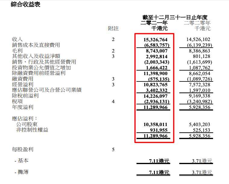 3月21日訊:嘉里建設(shè)有限公司(簡(jiǎn)稱:嘉里建設(shè),0683.HK)發(fā)布截至2021年12月31日止年度全年業(yè)績(jī),錄得綜合收入153.3億港元,按年上升6%;對(duì)應(yīng)毛利87.43億港元,毛利率57.04%,同比下降0.7個(gè)百分點(diǎn);年度凈利潤(rùn)112.9億港元,同比增長(zhǎng)90.4%%;凈利率73.66%,同比增長(zhǎng)32.85個(gè)百分點(diǎn);公司擁有人應(yīng)占溢利54.03億港元,同比減少21.66%。每股盈利為7.11港元,同比增加92%。股東應(yīng)占資產(chǎn)凈值為每股80.32港元,同比上升6%。