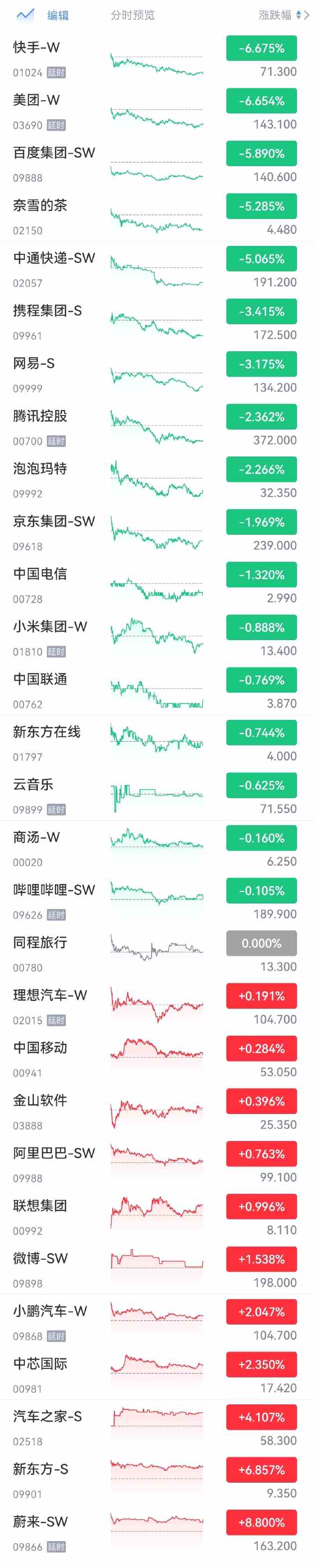 互聯(lián)網(wǎng)科技股普跌:快手、美團(tuán)收跌超6%,百度、奈雪、中通收跌超5%