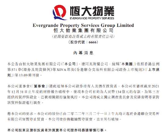 摘要: 3月22日消息,恒大物業(yè)在港交所公告,公司在審核截至2021年12月31日止年度的財務報告過程中,發(fā)現(xiàn)公司有約為人民幣134億元的存款,為第三方提供的質押保證金,已被相關銀行強制執(zhí)行。