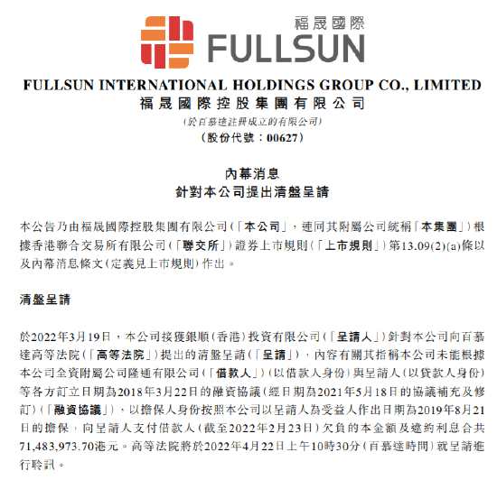 福晟國際:銀順香港投資針對(duì)本公司提出清盤呈請(qǐng) 欠付本息逾7000萬