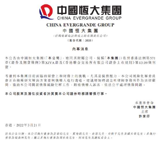 中國恒大:建議增加聘請(qǐng)金杜律師事務(wù)所作為法律顧問協(xié)助處理債務(wù)問題