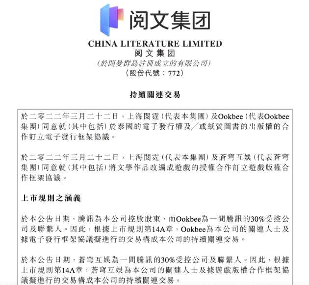 公告還顯示,騰訊為閱文集團(tuán)控股股東,蒼穹互娛為一間騰訊的30%受控公司及聯(lián)系人。因此,根據(jù)上市規(guī)則第14A章,蒼穹互娛為本公司的關(guān)連人士及據(jù)游戲版權(quán)合作框架協(xié)議擬進(jìn)行的交易構(gòu)成本公司的持續(xù)關(guān)連交易。