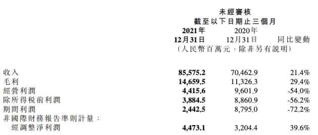 小米集團2021年第四季度主要業(yè)績數(shù)據(jù):