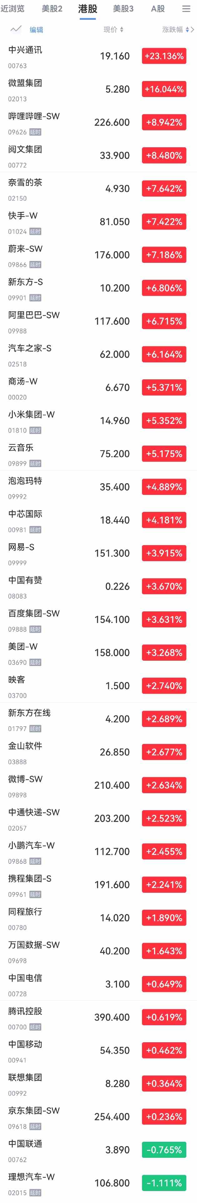恒生科技指數(shù)漲2.05%,中興通訊漲超23%,微盟集團漲超16%