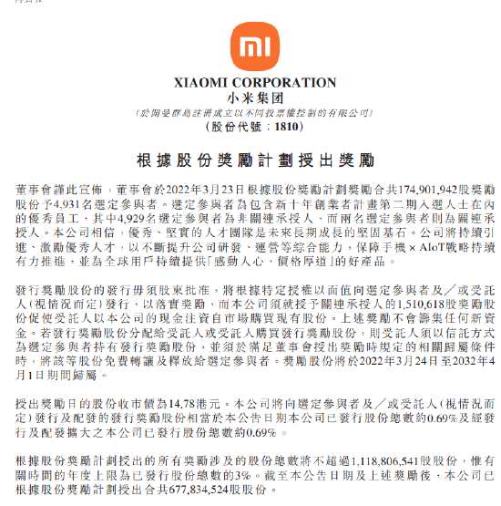 摘要: 3月24日消息,小米集團(tuán)-W(01810.HK)發(fā)布公告,董事會于2022年3月23日根據(jù)股份獎(jiǎng)勵(lì)計(jì)劃獎(jiǎng)勵(lì)合共174,901,942股獎(jiǎng)勵(lì)股份予4,931名選定參與者。