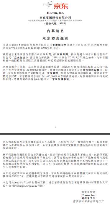 新浪科技訊 3月25日早間消息,京東集團公告,京東物流已簽訂配售協(xié)議,據(jù)此京東物流同意以配售方式向一批第三方投資者發(fā)行150,500,000普通股,總購買約價為3.98億美元。