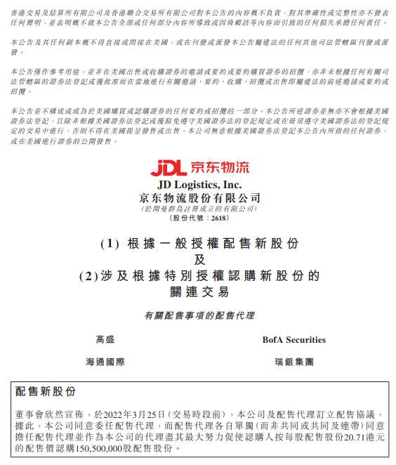 引發(fā)京東物流大幅調(diào)整,這得歸因于該公司在早盤(pán)公布一則公告,其中該公司擬透過(guò)配售新股募資,同時(shí)向其控股股東京東集團(tuán)-SW(09618.HK)增發(fā)股票,雙管齊下合計(jì)募資約11億美元,折合人民幣約70.05億元。