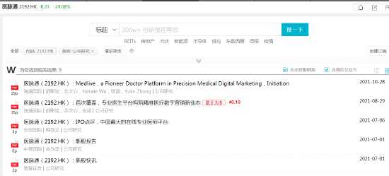 摘要: 3月25日消息,醫(yī)脈通績后暴跌24%,今年股價暴跌70%,市值59億港元,此前市值一度高達300多億港元,wind數(shù)據(jù)顯示,公司已經(jīng)有半年沒有券商覆蓋。醫(yī)脈通科技是中國最大的在線專業(yè)醫(yī)師平臺,
