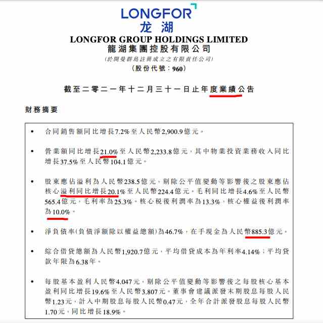 3月26日訊:3月25日,龍湖集團控股有限公司(簡稱:龍湖集團,0960.HK)在港公布其截至2021年12月31日止全年業(yè)績(下稱年報)。