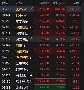 3月28日消息,恒生科技指數(shù)漲幅擴大至3.41%,美團漲超13%,快手漲超6%,阿里漲超5%,騰訊漲近4%,嗶哩嗶哩漲超3%。