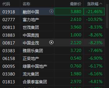 3月29日消息,內(nèi)房股集體走低,融創(chuàng)中國跌超21%,富力地產(chǎn)跌近11%,世茂集團、中國奧園、中國金茂跌超8%,雅居樂集團跌超7%。