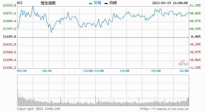 3月29日消息,美股周一收高,科技股領(lǐng)漲。今日開盤,恒生指數(shù)高開0.4%,盤中一度漲超1%。截止收盤,恒生指數(shù)漲1.12%,報(bào)21927.63點(diǎn);國企指數(shù)漲1.58%,紅籌指數(shù)漲0.03%。