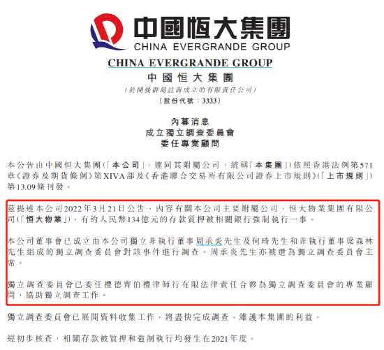 摘要: 3月29日晚間,中國恒大、恒大物業(yè)聯(lián)合發(fā)布公告公告,關(guān)于恒大物業(yè)約134億元的存款質(zhì)押被相關(guān)銀行強制執(zhí)行一事,公司董事會已成立由公司獨立非執(zhí)行董事周承炎及何琦和非執(zhí)行董事梁森林組成的獨立調(diào)查委員會對該