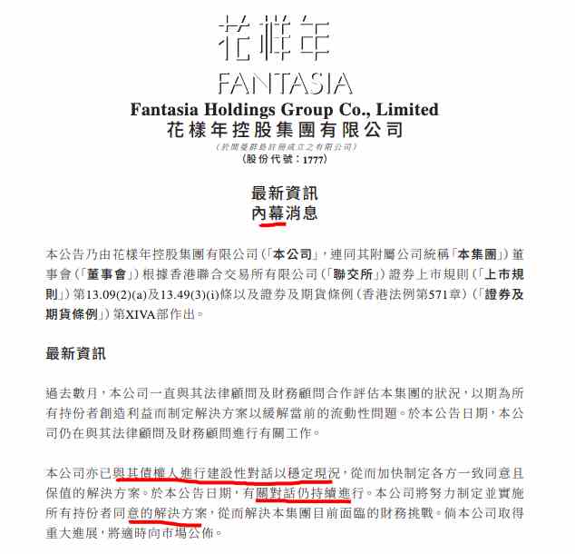 此外,公告中花樣年控股還透露,過去數(shù)月,公司一直與其法律顧問及財(cái)務(wù)顧問合作評(píng)估本集團(tuán)的狀況,以期為所有持份者創(chuàng)造利益而制定解決方案以緩解當(dāng)前的流動(dòng)性問題。于本公告日期,公司仍在與其法律顧問及財(cái)務(wù)顧問進(jìn)行有關(guān)工作。