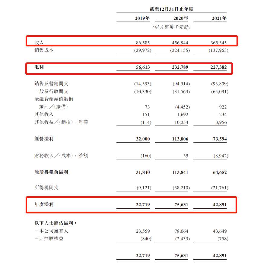 財(cái)務(wù)數(shù)據(jù)方面,2019年、2020年及2021年,巨星傳奇收入分別為8658.5萬、約4.57億、約3.65億元人民幣,復(fù)合年增長率約為105.4%。同期,年內(nèi)溢利分別為2271.9萬元、7563.1萬元、4289.1萬元人民幣,復(fù)合年增長率約為37.5%。經(jīng)調(diào)整,年內(nèi)溢利分別為2271.9萬元、8036.4萬元、6993.3萬元。