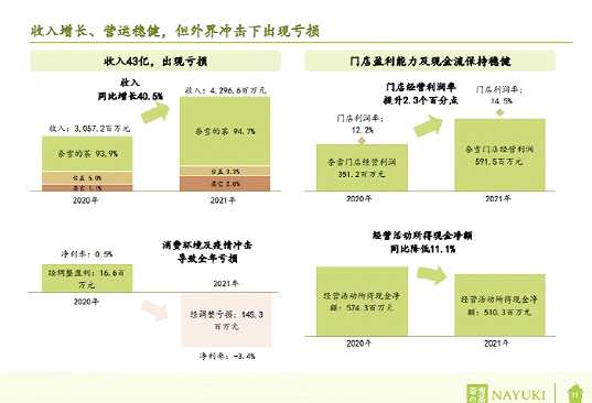3月29日晚間,“茶飲第一股”奈雪的茶發(fā)布2021年業(yè)績公告:2021年總收入同比增長了40.5%至42.96億元人民幣,在盈利方面,經(jīng)調(diào)整后凈利潤虧損為1.45億元。